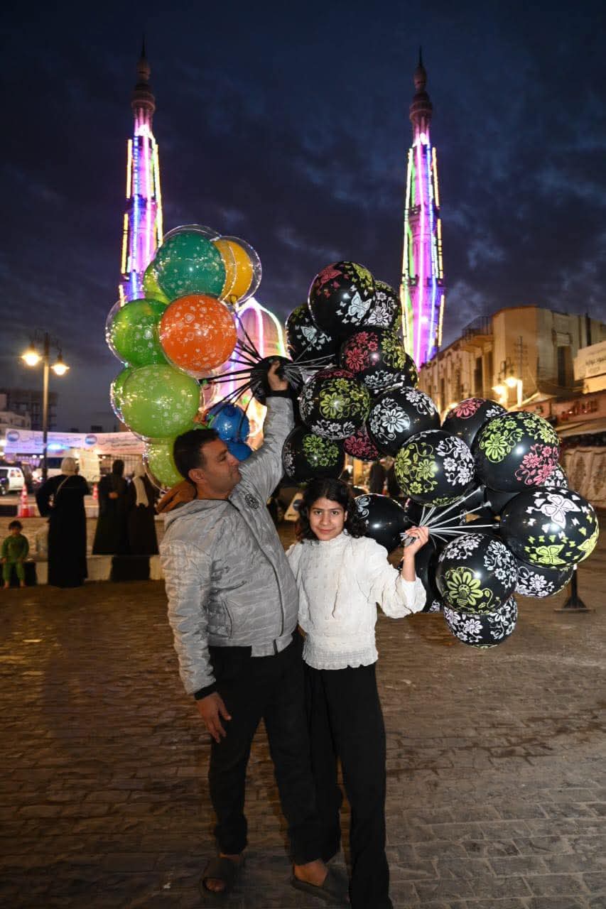 وكانت الأسر والعائلات اصطحبوا أطفالهم وذويهم للاحتفال بعيد الفطر بتوزيع البالونات وإعلاء رايات التكبير ابتهاجا بحلول عيد الفطر .