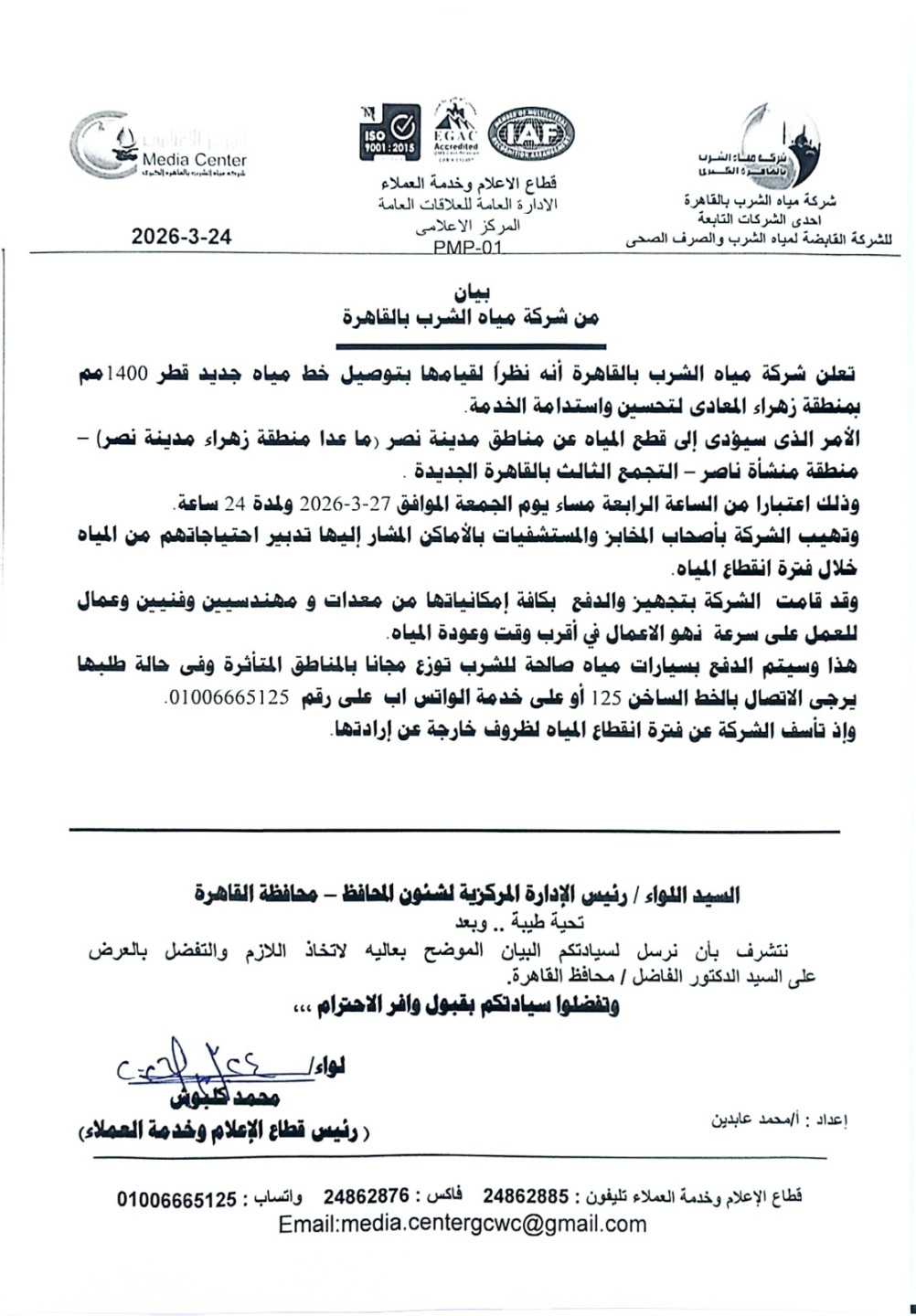 أشارت فيه إلى أنه سيتم قطع المياه لمدة 24 ساعة يوم الجمعة القادمة، وذلك لإجراء أعمال الصيانة اللازمة على الشبكات الرئيسية لضمان تحسين الخدمة واستقرار الإمدادات.