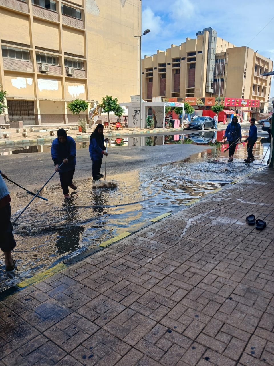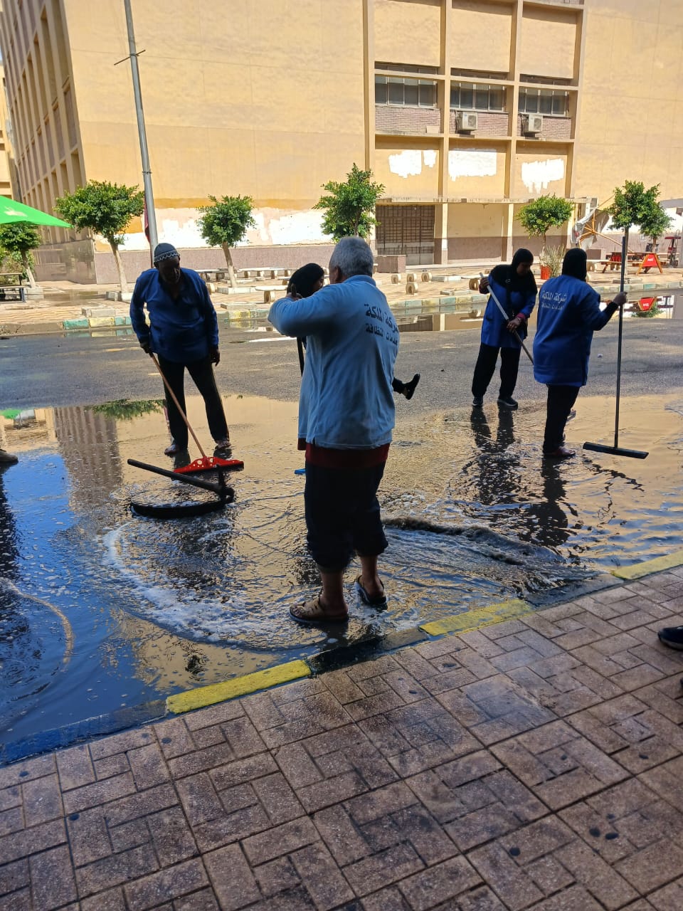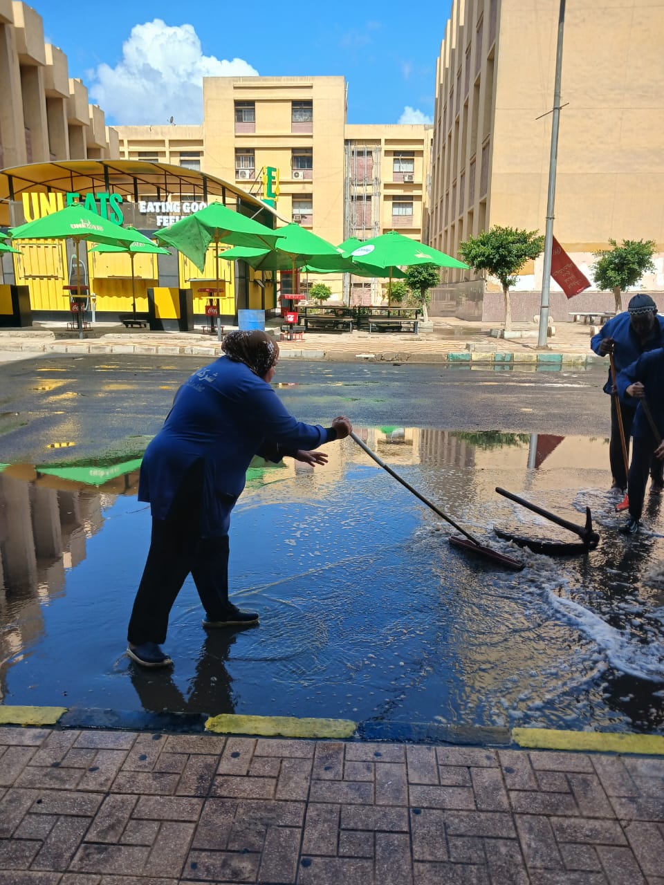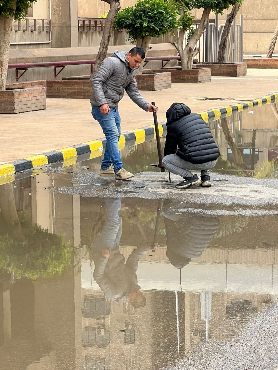 وشملت أعمال المتابعة أيضاً التعامل مع المساحات الخضراء المحيطة بحرم الكلية، حيث تم تأمينها وإزالة المياه الزائدة بها، بما يسهم في الحفاظ على سلامة التربة والممرات المحيطة بالمباني ومنع تأثير تجمعات المياه عليها.