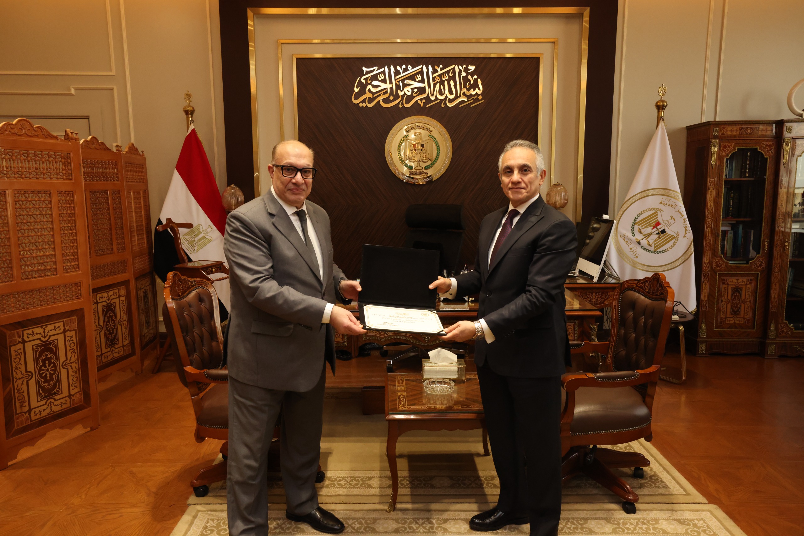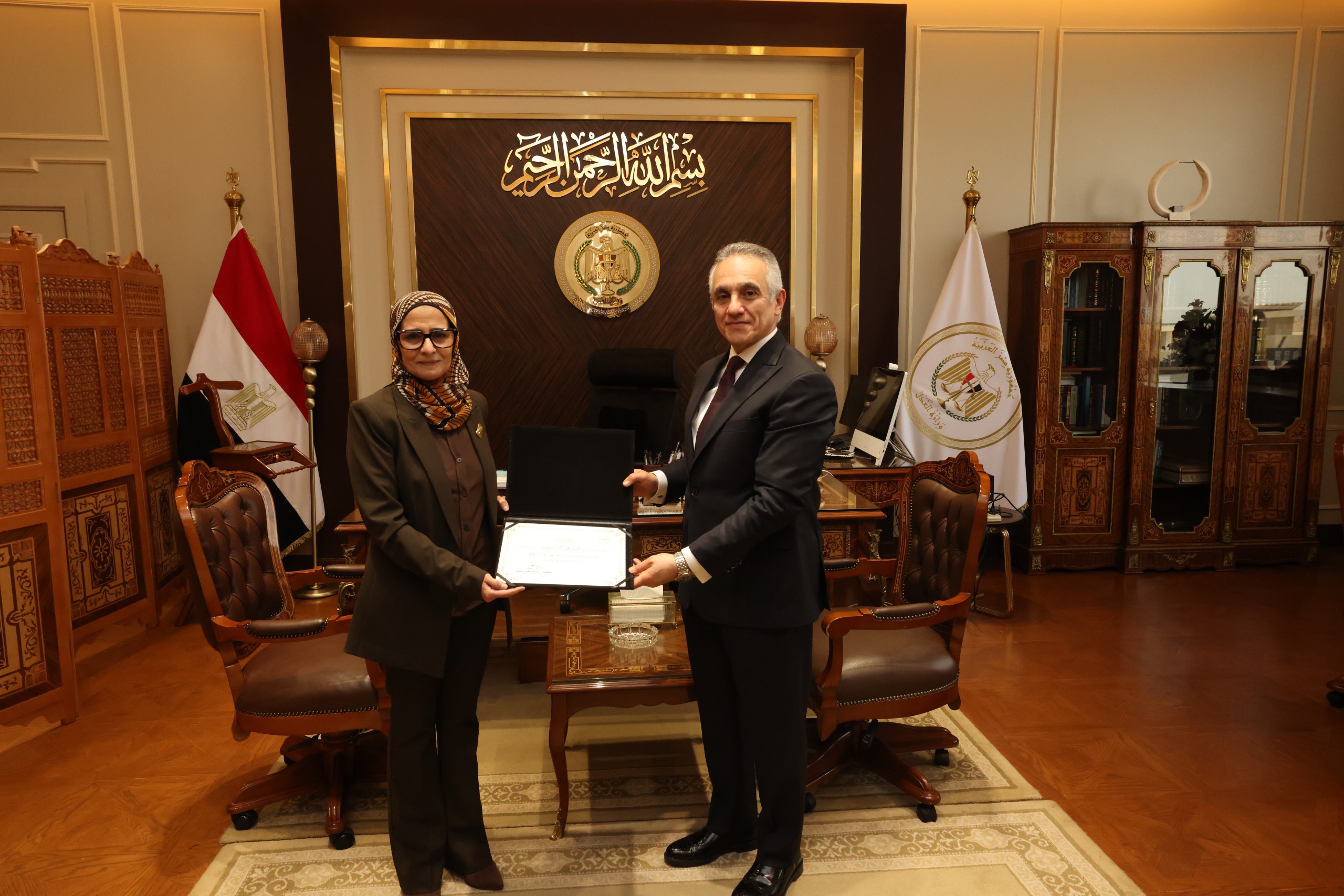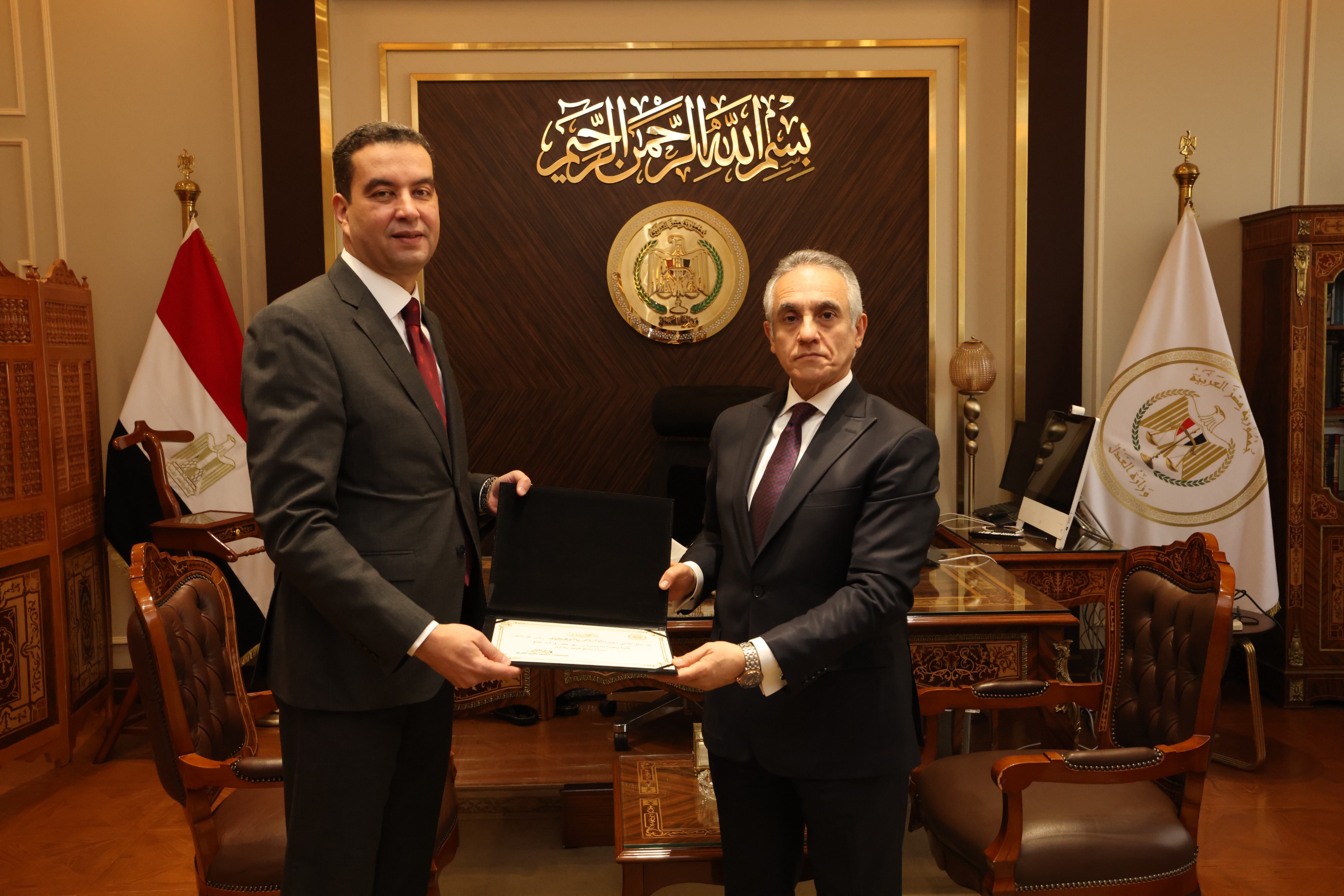 من ناحية أخرى، قام وزير العدل بتكريم مساعدي وزير العدل السابقين في لفتة طيبة تعكس التقدير لجهودهم خلال فترة عملهم، وإسهاماتهم في دعم منظومة العمل داخل الوزارة، وذلك في إطار الحرص على تكريم الكفاءات ودورها في تحقيق التطوير المؤسسي وتعزيز كفاءة الأداء.