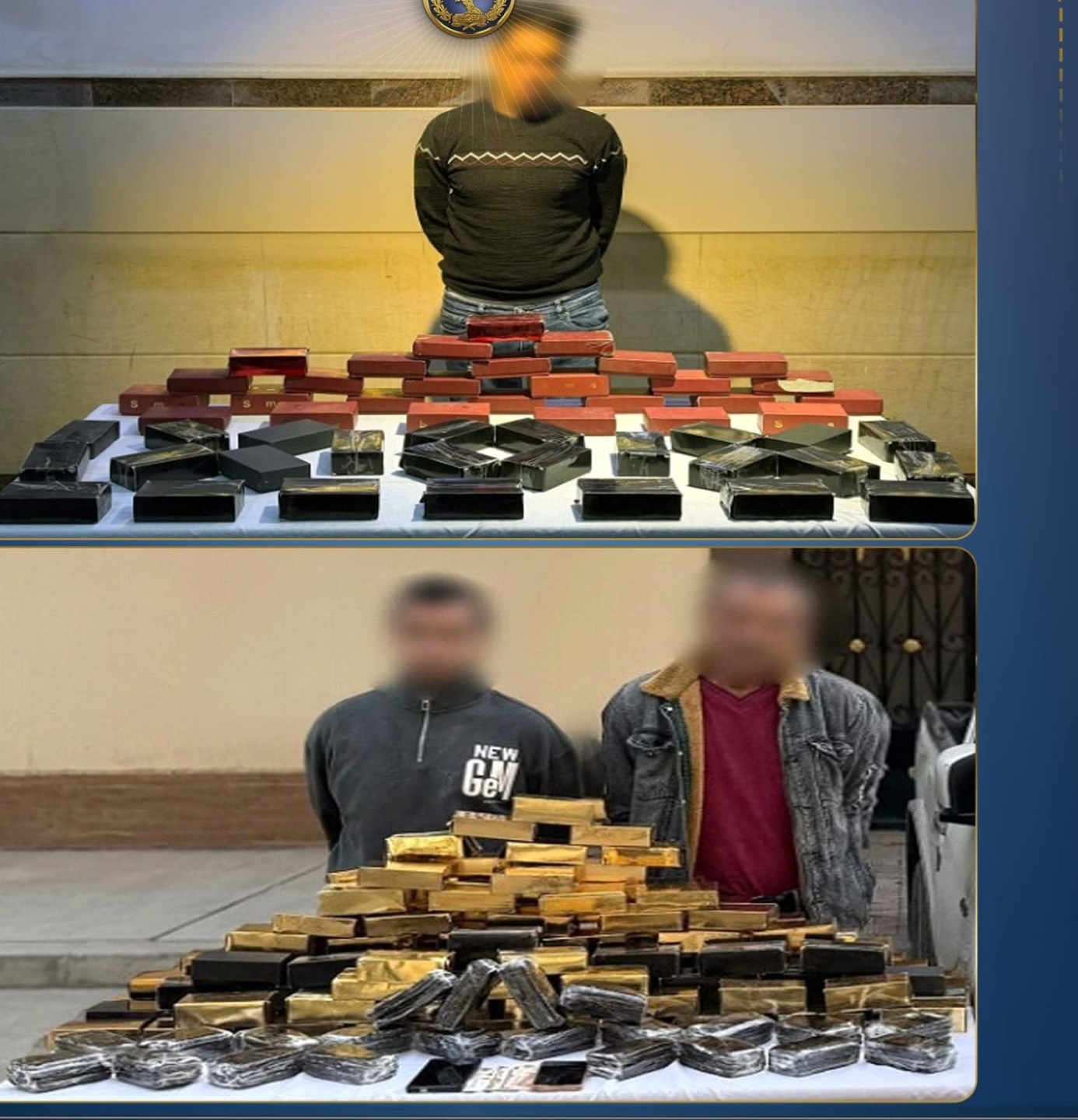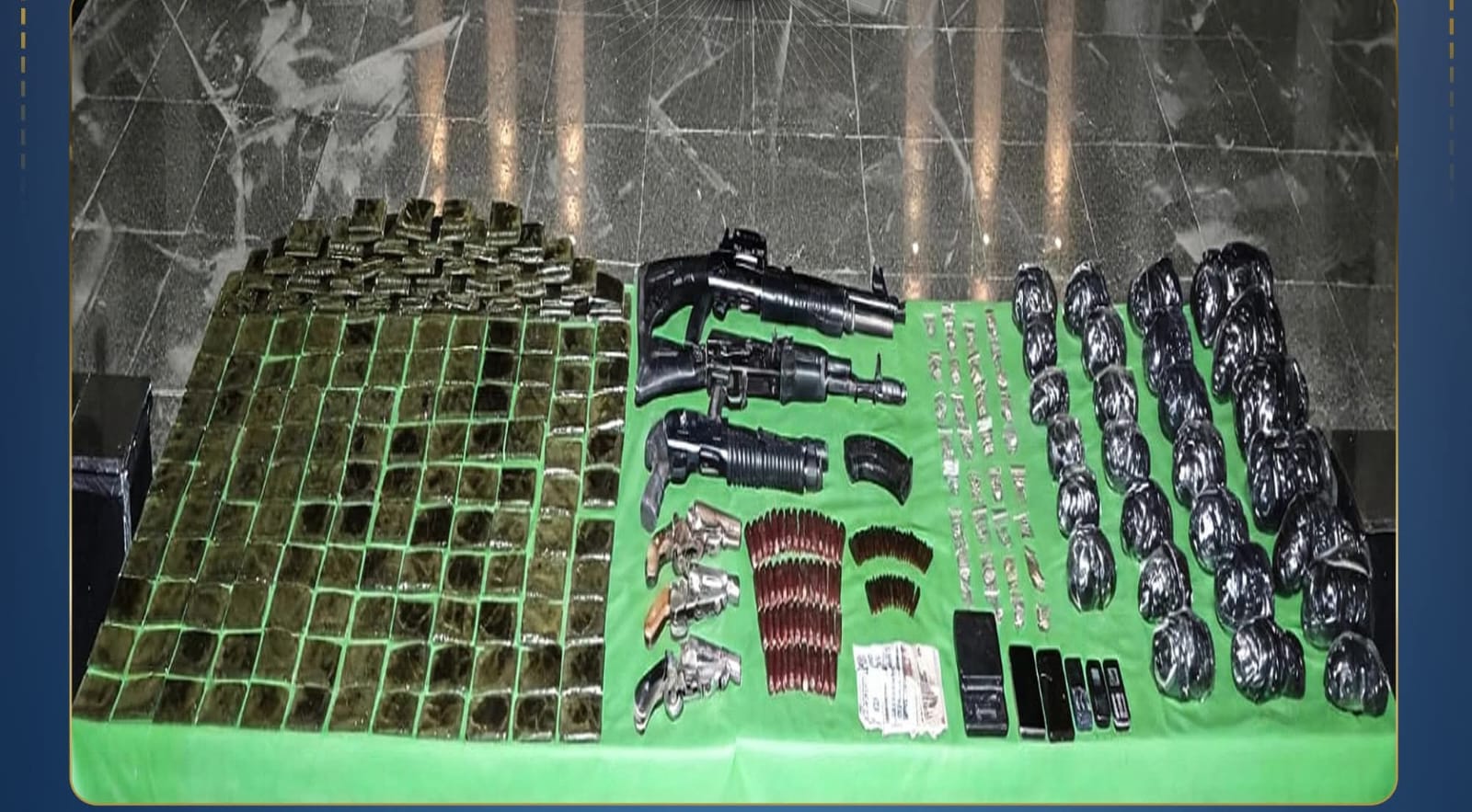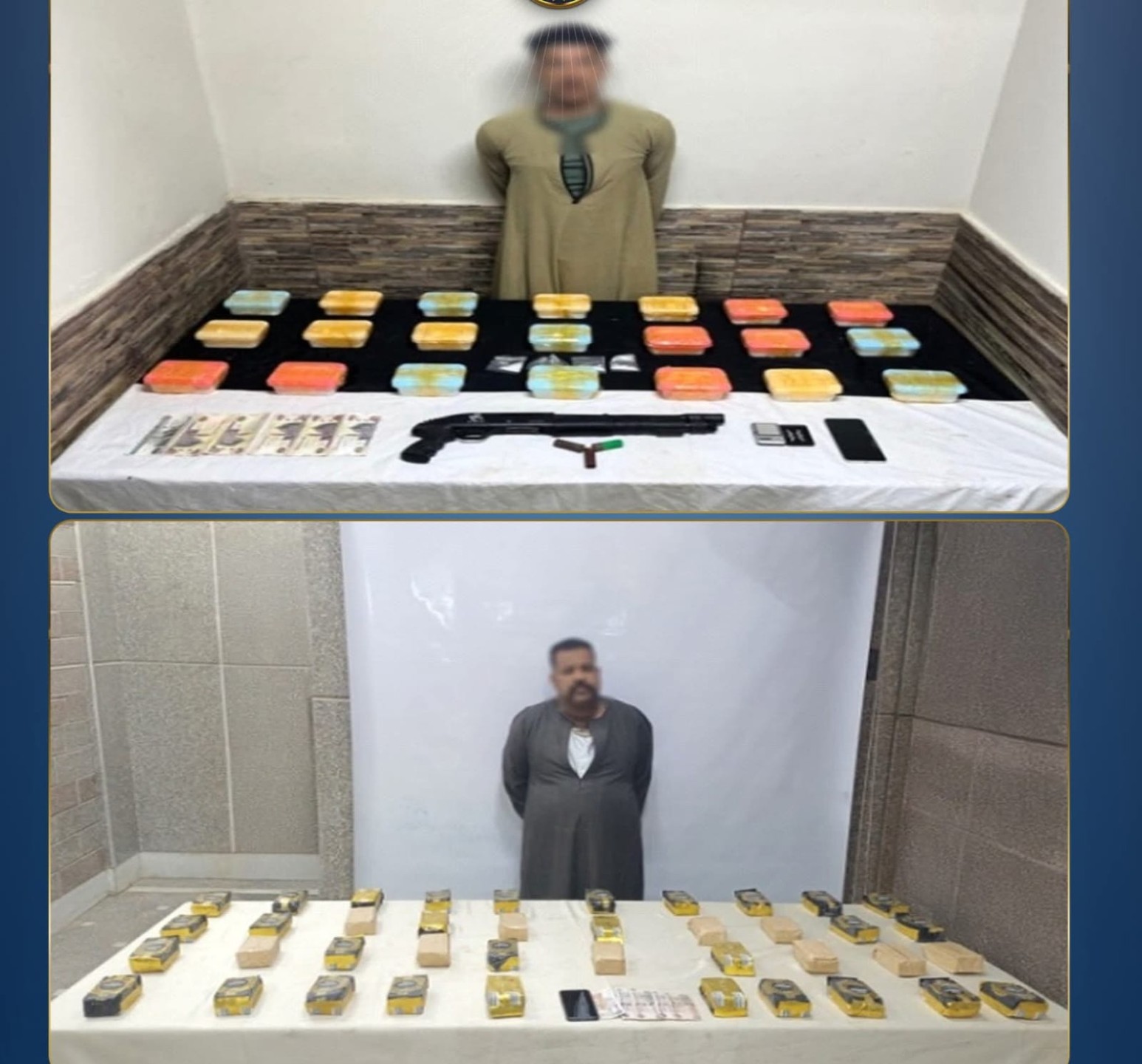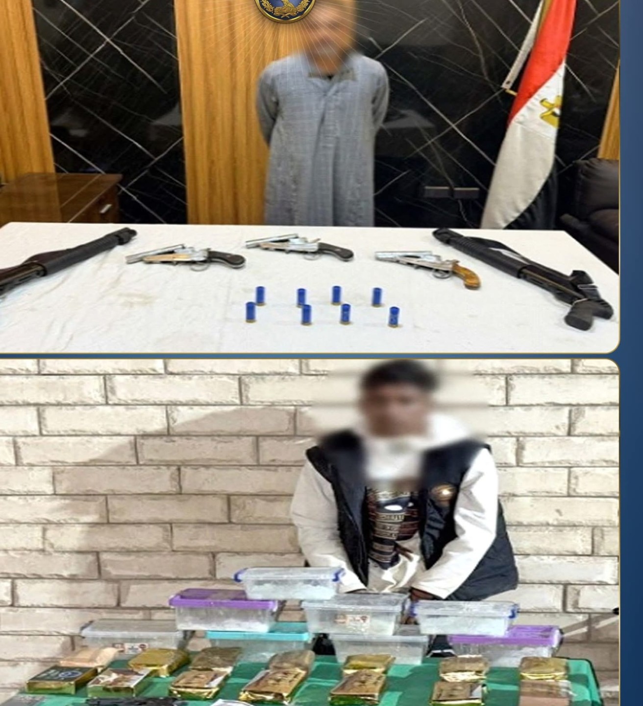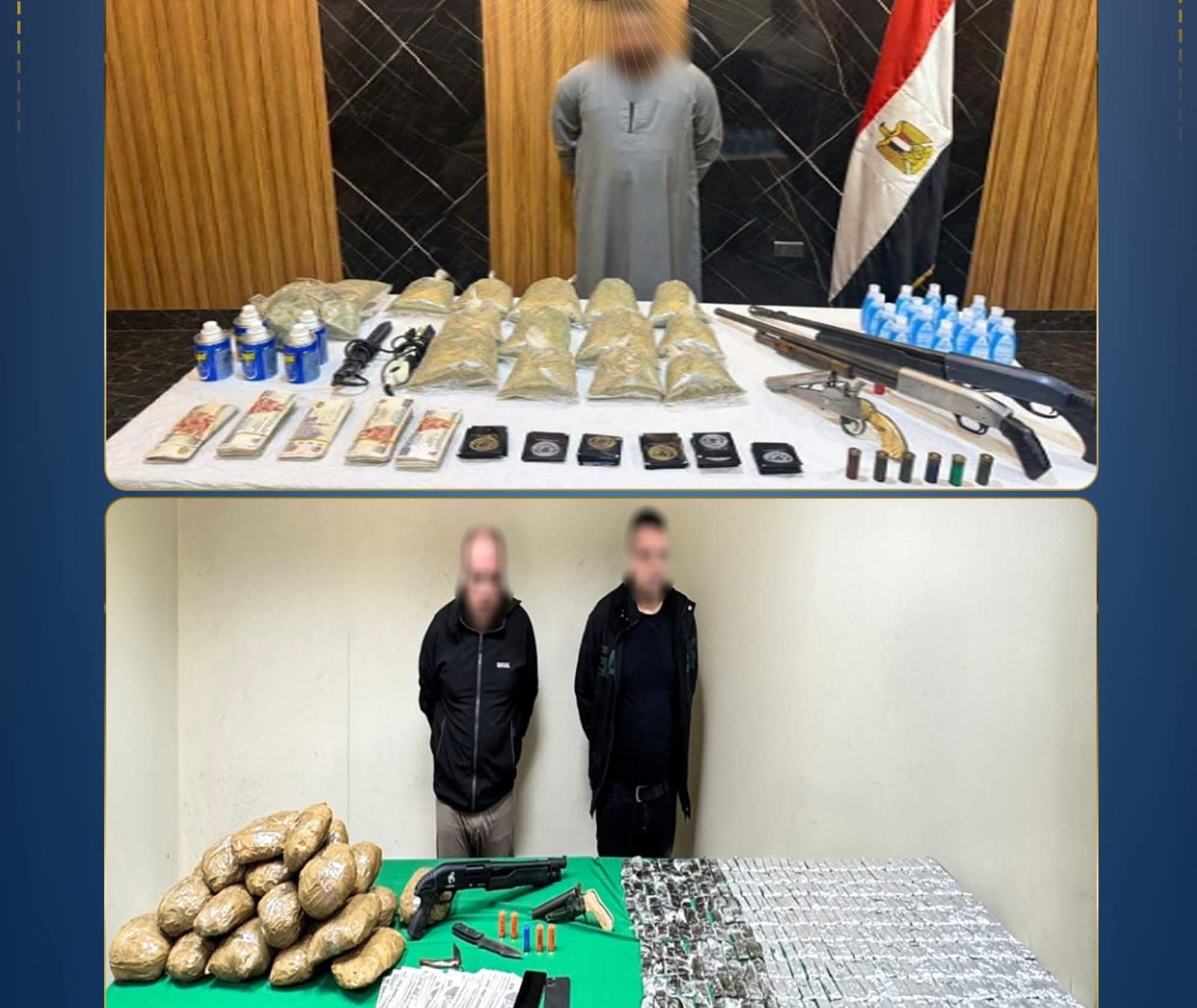 فى إطار مواصلة وزارة الداخلية توجيه الضربات الإستباقية للبؤر الإجرامية جالبى ومتجرى المواد المخدرة وحائزى الأسلحة النارية غير المرخصة فقد أكدت معلومات وتحريات قطاعى الأمن العام ومكافحة المخدرات والأسلحة والذخائر غير المرخصة) بالتنسيق مع أجهزة الوزارة المعنية قيام بؤر إجرامية بنطاق عدد من المحافظات تضم (عناصر جنائية شديدة الخطورة) بجلب كميات من المواد المخدرة والأسلحة النارية غير المرخصة تمهيداً للإتجار بها وعقب تقنين الإجراءات تم إستهدافهم بمشاركة قطاع الأمن المركزى ، وقد أسفر التعامل عن مصرع 5 عناصر جنائية شديدى الخطورة محكوم عليهم بالسجن فى جنايات "إتجار مخدرات – سلاح بدون ترخيص– سرقة بالإكراه وبلطجة-فرض سيطرة بنطاق محافظة الجيزة ، وضبط باقى عناصر تلك البؤر، وبحوزتهم (قرابة طن من المواد المخدرة المتنوعة "حشيش ، هيدرو ، شابو "آيس"، إستروكس - هيروين و69 قطعة سلاح نارى51 بندقية آلية ، 8 بنادق خرطوش و9 فرد خرطوش ، طبنجة هذا وتقدر القيمة المالية للمواد المخدرة المضبوطة أكثر من 95 مليون جنيه تم إتخاذ الإجراءات القانونية.