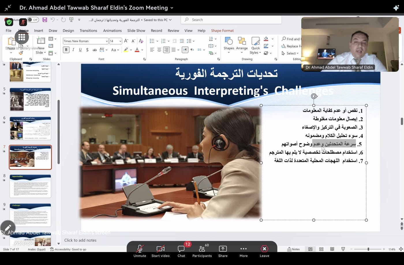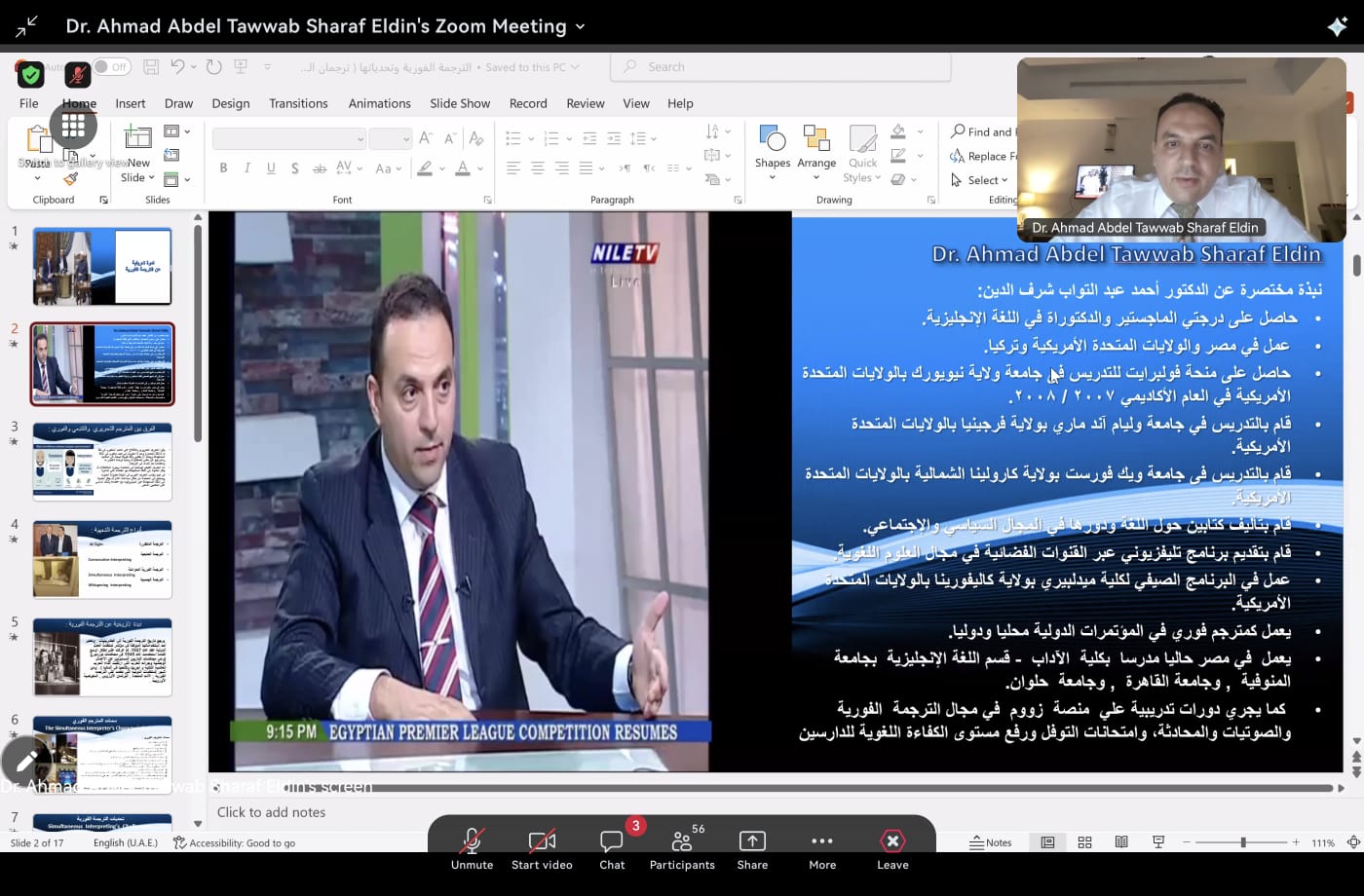 نظمت وحدة دعم الابتكار وريادة الأعمال بكلية الألسن – جامعة عين شمس محاضرة أونلاين بعنوان «الترجمة الفورية في عصر الذكاء الاصطناعي» عبر منصة Zoom، وذلك في إطار اهتمام الجامعة بمواكبة التحولات التكنولوجية المتسارعة، وحرص كلية الألسن على تطوير مهارات طلابها وتأهيلهم للتعامل مع متطلبات سوق العمل الحديثة في مجالات اللغات والترجمة.