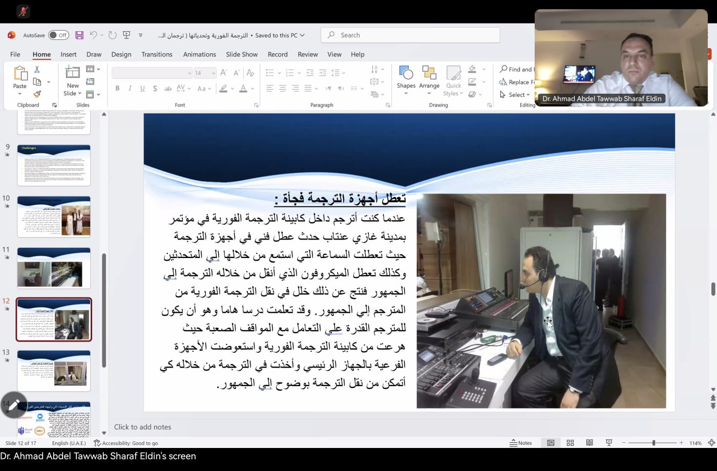 قدم المحاضرة الدكتور أحمد عبدالتواب شرف الدين، الأستاذ المشارك في تخصص اللغة الإنجليزية والترجمة الفورية، والمترجم المعتمد لدى عدد من الجامعات المصرية والأمريكية، إلى جانب عمله مستشارًا تعليميًا بدولة الإمارات العربية المتحدة، حيث تناول خلال اللقاء التحولات المتسارعة التي يشهدها مجال الترجمة الفورية في ظل التطور المتنامي لتقنيات الذكاء الاصطناعي، وما يفرضه ذلك من متغيرات على طبيعة المهنة ومستقبلها.