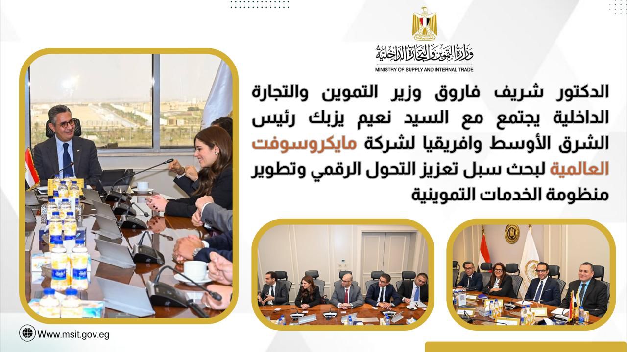 في إطار توجه الدولة نحو التحول الرقمي وبناء اقتصاد قائم على المعرفة، عقد الدكتور شريف فاروق، وزير التموين والتجارة الداخلية، اجتماعًا مع مسؤولي شركة مايكروسوفت العالمية، لبحث سبل التعاون المشترك في تطوير البنية التكنولوجية للوزارة، والارتقاء بمنظومة الخدمات التموينية المقدمة للمواطنين.