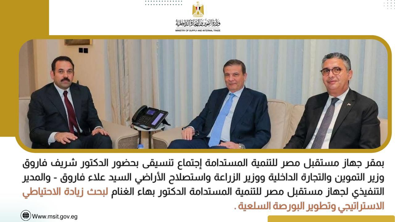 بمقر الجهاز عُقد اجتماع تنسيقي ضم كلًا من وزير التموين والتجارة الداخلية، الدكتور شريف فاروق ووزير الزراعة واستصلاح الأراضي، السيد علاء فاروق، والمدير التنفيذي لجهاز مستقبل مصر للتنمية المستدامة، الدكتور بهاء الغنام، وذلك في إطار جهود تعزيز التنسيق بين الجهات المعنية، بما يسهم في تحقيق التكامل بين عناصر «مثلث الأمن الغذائي» المتمثلة في الإنتاج والتوزيع وإدارة المخزون الاستراتيجي.