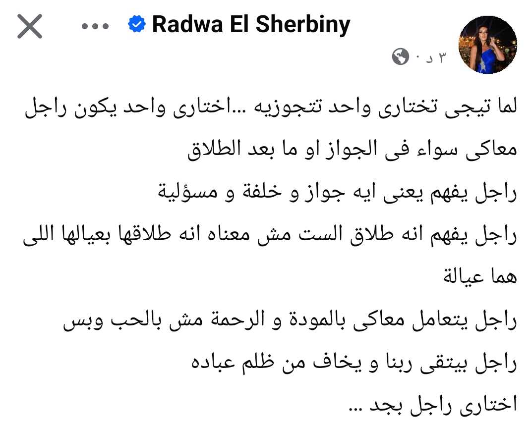 وكتبت رضوى الشربينى عبر حسابها الرسمى على «فيسبوك»: «لما تيجى تختارى واحد تتجوزيه، اختارى واحد يكون راجل معاكى سواء فى الجواز أو ما بعد الطلاق، راجل يفهم يعنى ايه جواز وخلفة ومسؤلية»