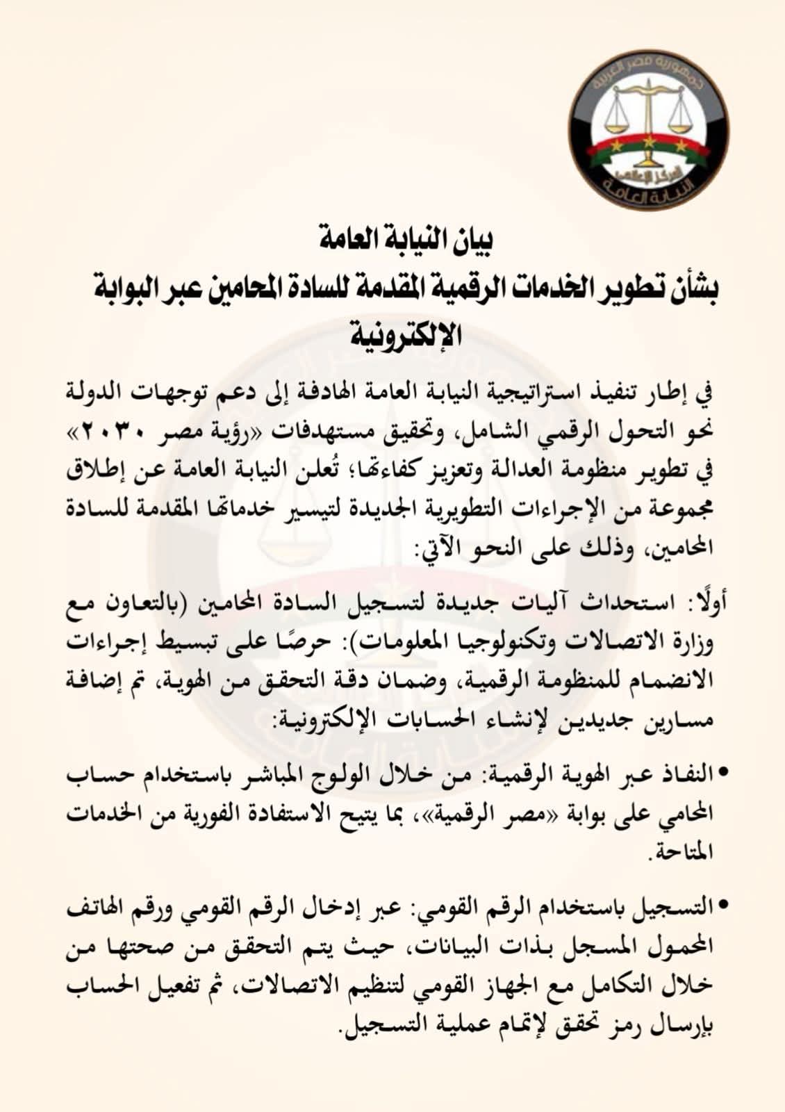 بيان النيابة العامة بشأن تطوير الخدمات الرقمية المقدمة للسادة المحامين عبر البوابة الإلكترونية