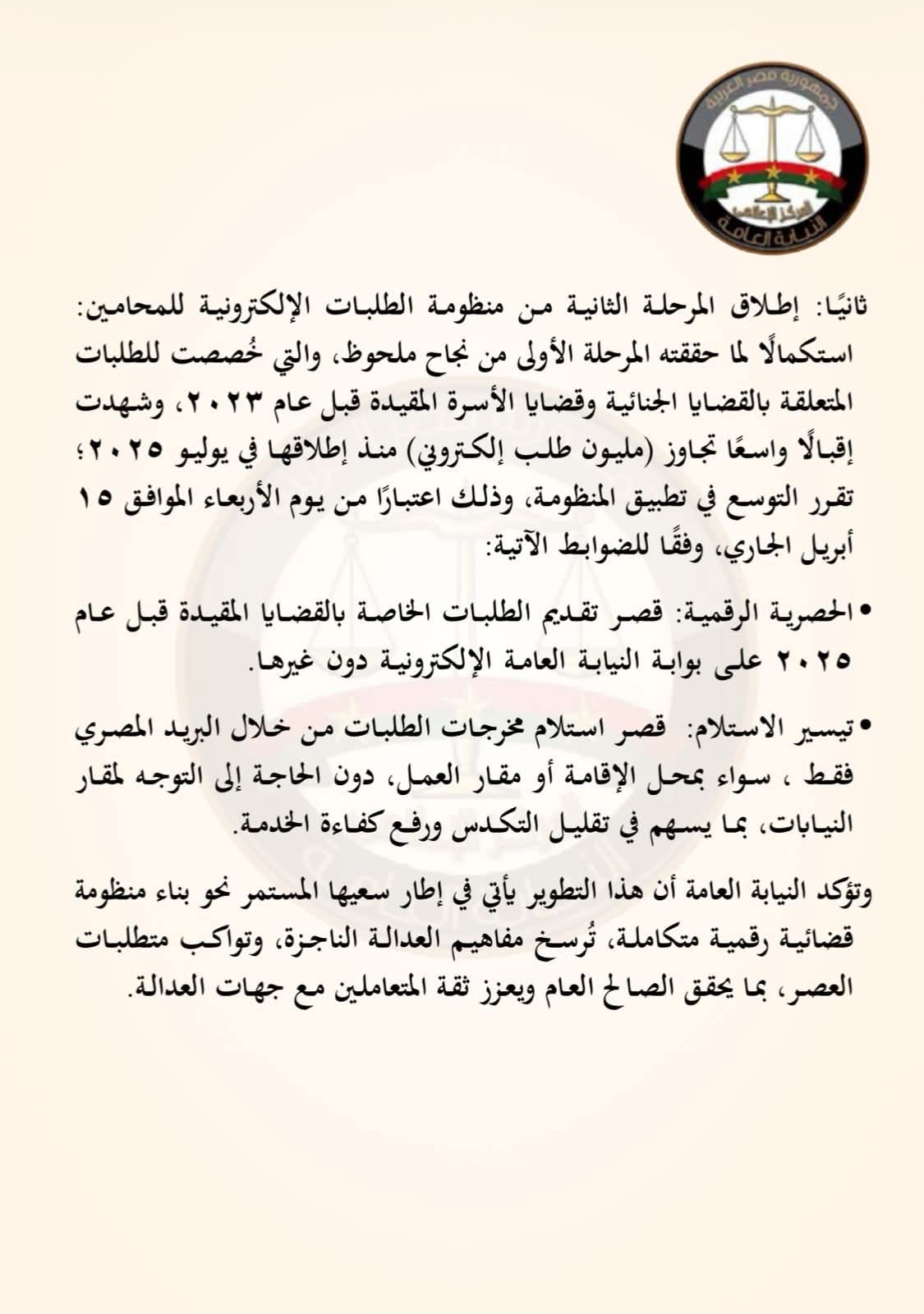 استكمالًا لما حققته المرحلة الأولى من نجاح ملحوظ، والتي خُصصت للطلبات المتعلقة بالقضايا الجنائية وقضايا الأسرة المقيدة قبل عام ٢٠٢٣، وشهدت إقبالًا واسعًا تجاوز (مليون طلب إلكتروني) منذ إطلاقها في يوليو ٢٠٢٥؛ تقرر التوسع في تطبيق المنظومة، وذلك اعتبارًا من يوم الأربعاء الموافق ١٥ أبريل الجاري، وفقًا للضوابط الآتية: