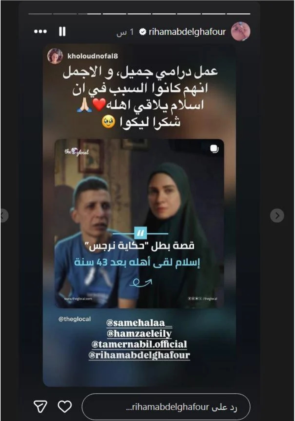 وعلى ستوري صفحتها الرسمية بموقع إنستجرام، نشرت ريهام عبد الغفور عدة صور من إشادات بعض المواقع، ونشطاء مواقع التواصل الاجتماعي بمسلسل حكاية نرجس، والذي قامت ببطولته النجمة ريهام عبد الغفور خلال ماراثون دراما الشركة المتحدة للخدمات الإعلامية في رمضان 2026، حيث سلط الضوء على قصة خطف الأطفال، وأهمية رعاية الوالدين لأبنائهما الصغار، والتشديد على أهمية عدم تركهم لأي أحد غريب غير معروف.