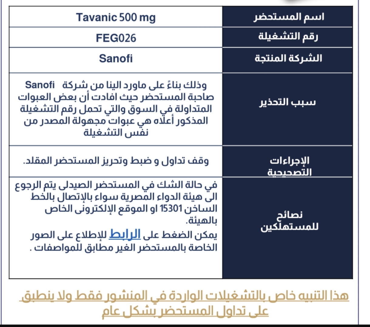 أعلنت هيئة الدواء المصرية عن سحب عبوات مقلدة من دواء “تافانيك 500 مجم” (Tavanic 500 mg)، أحد المضادات الحيوية واسعة الاستخدام، وذلك بعد رصد تداول تشغيلات غير مطابقة للمواصفات في السوق المحلي.
