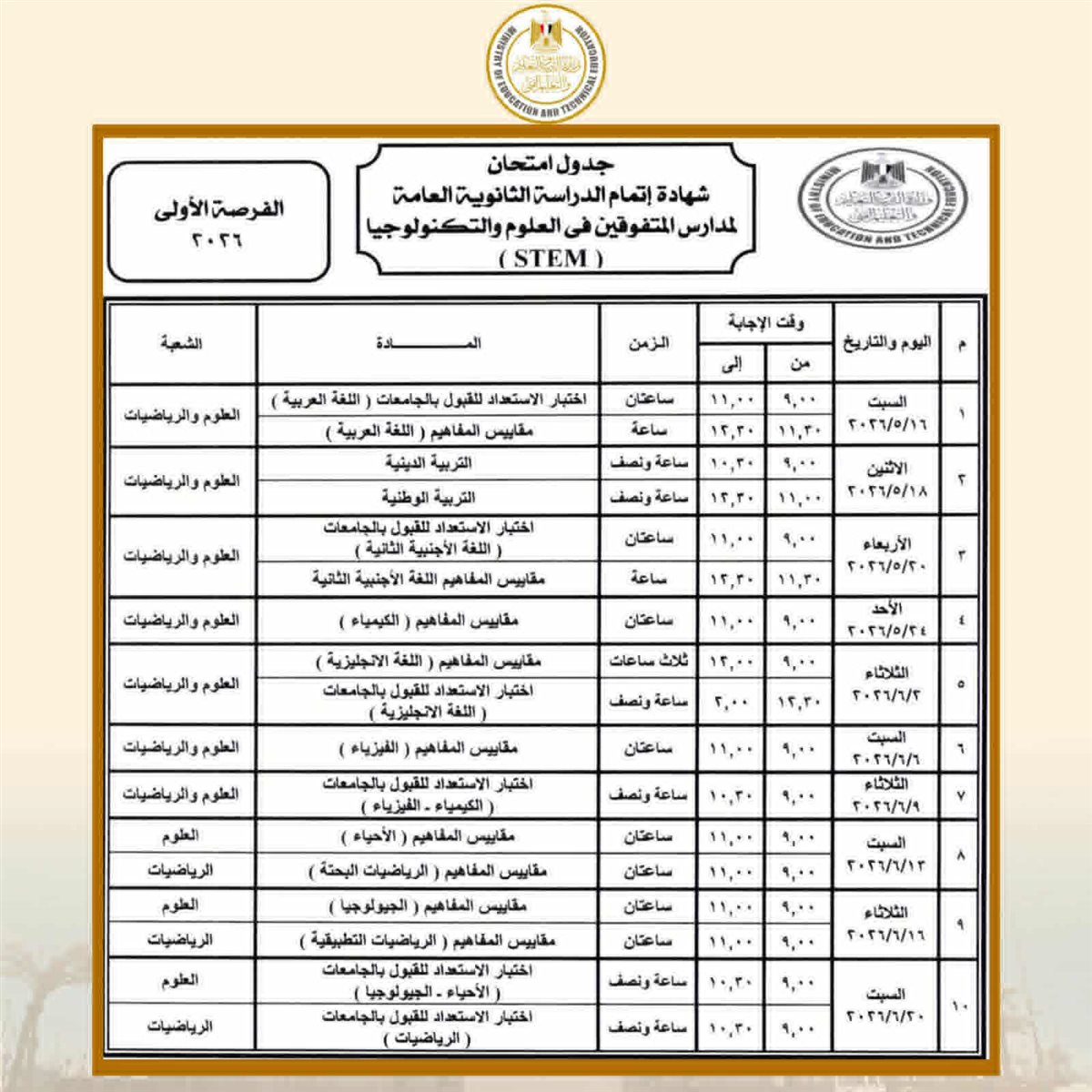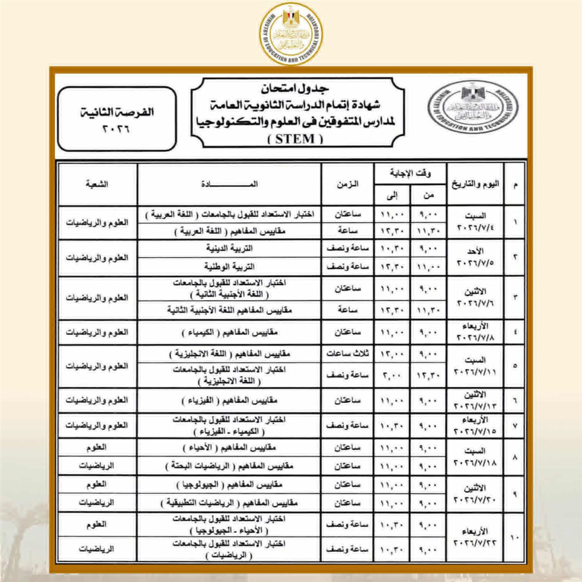 تبدأ امتحانات شهادة إتمام الثانوية العامة بمدارس المتفوقين في العلوم والتكنولوجيا "STEM” (الفرصة الأولى) يوم 16 مايو 2026 وتنتهي يوم 20 يونيو 2026، وتبدأ امتحانات (الفرصة الثانية) يوم السبت 4 يوليو 2026 وتنتهي يوم 22 يوليو 2026.