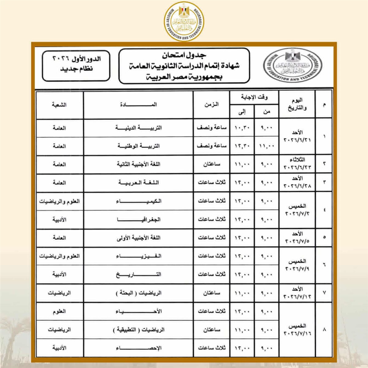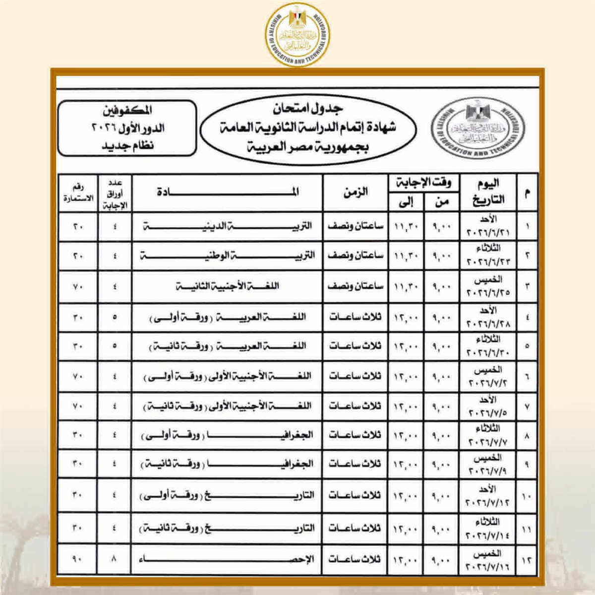 وبحسب جداول امتحانات الثانوية العامة، تبدأ امتحانات الثانوية العامة للدور الأول (نظام جديد - نظام قديم) والمكفوفين يوم الأحد الموافق 21 يونيو 2026، وتستمر حتى يوم الخميس 17 يوليو 2026.