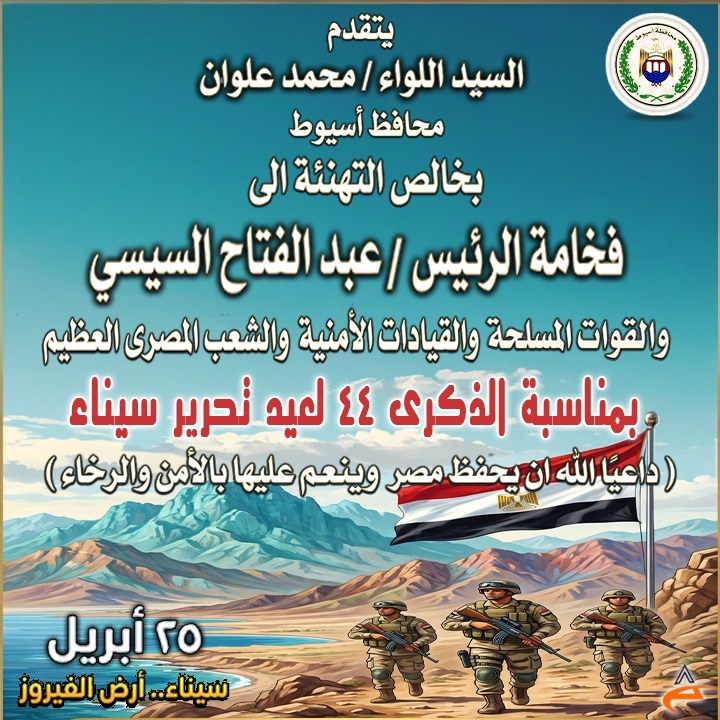 وجاء في نص البرقية: "يسعدني ويشرفني أن أتقدم لسيادتكم، بالإصالة عن نفسي وبالإنابة عن أبناء محافظة أسيوط، بأصدق التهاني وأطيب التمنيات بمناسبة ذكرى تحرير سيناء الغالية، داعيًا المولى عز وجل أن يعيد هذه المناسبة الوطنية المجيدة على سيادتكم بموفور الصحة والعافية، وأن يوفقكم لاستكمال مسيرة البناء والتنمية الشاملة التي تشهدها مصر في ظل قيادتكم الحكيمة، وأن يديم على وطننا الغالي نعمة الأمن والاستقرار والتقدم، حفظ الله مصر قيادةً وشعبًا، وكل عام وأنتم بخير."