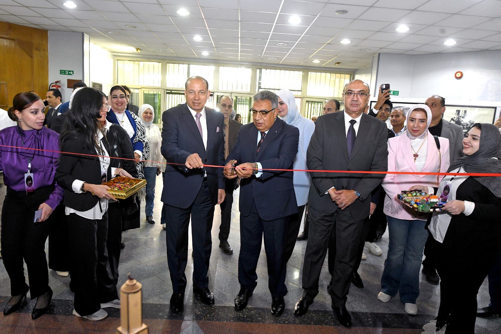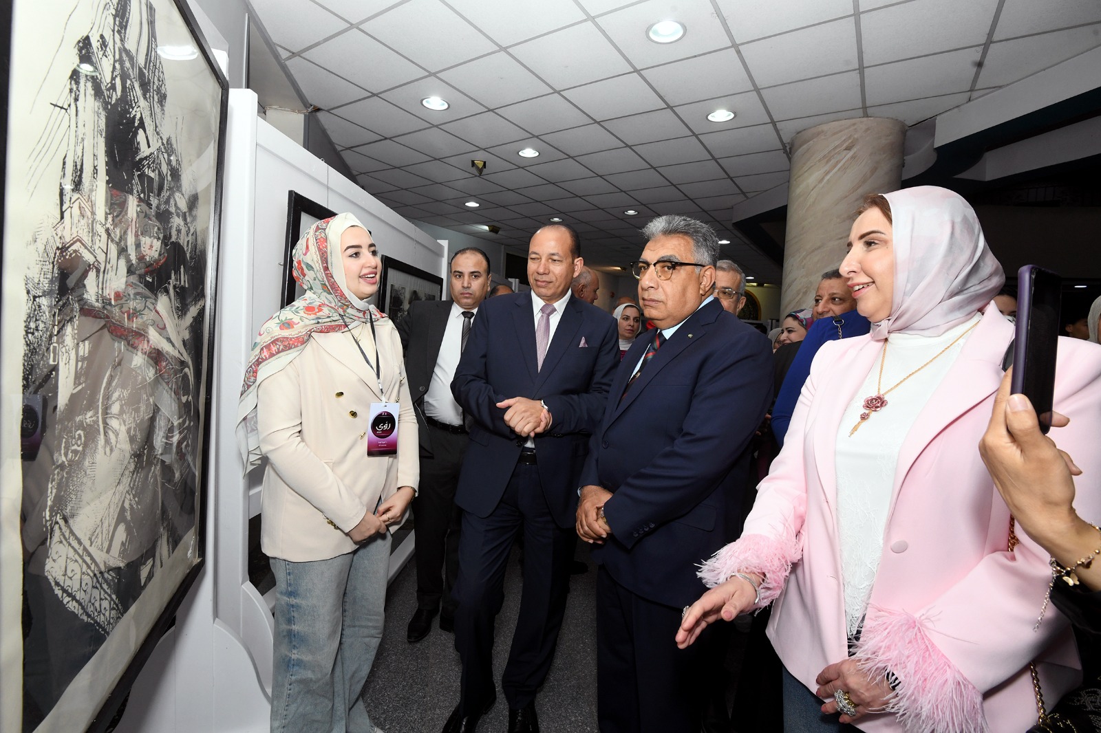 حضر الافتتاح الدكتور محمد عطية البيومي، نائب رئيس الجامعة لشؤون التعليم والطلاب، والدكتور طارق غلوش، نائب رئيس الجامعة لشؤون الدراسات العليا والبحوث والمشرف على قطاع خدمة المجتمع وتنمية البيئة، والدكتورة نشوى الشافعي، عميد كلية الفنون الجميلة والمشرف على المعرض، والسادة عمداء ووكلاء الكليات، ولفيف من أعضاء هيئة التدريس، والفنانين التشكيليين، والصحفيين، والإعلاميين.