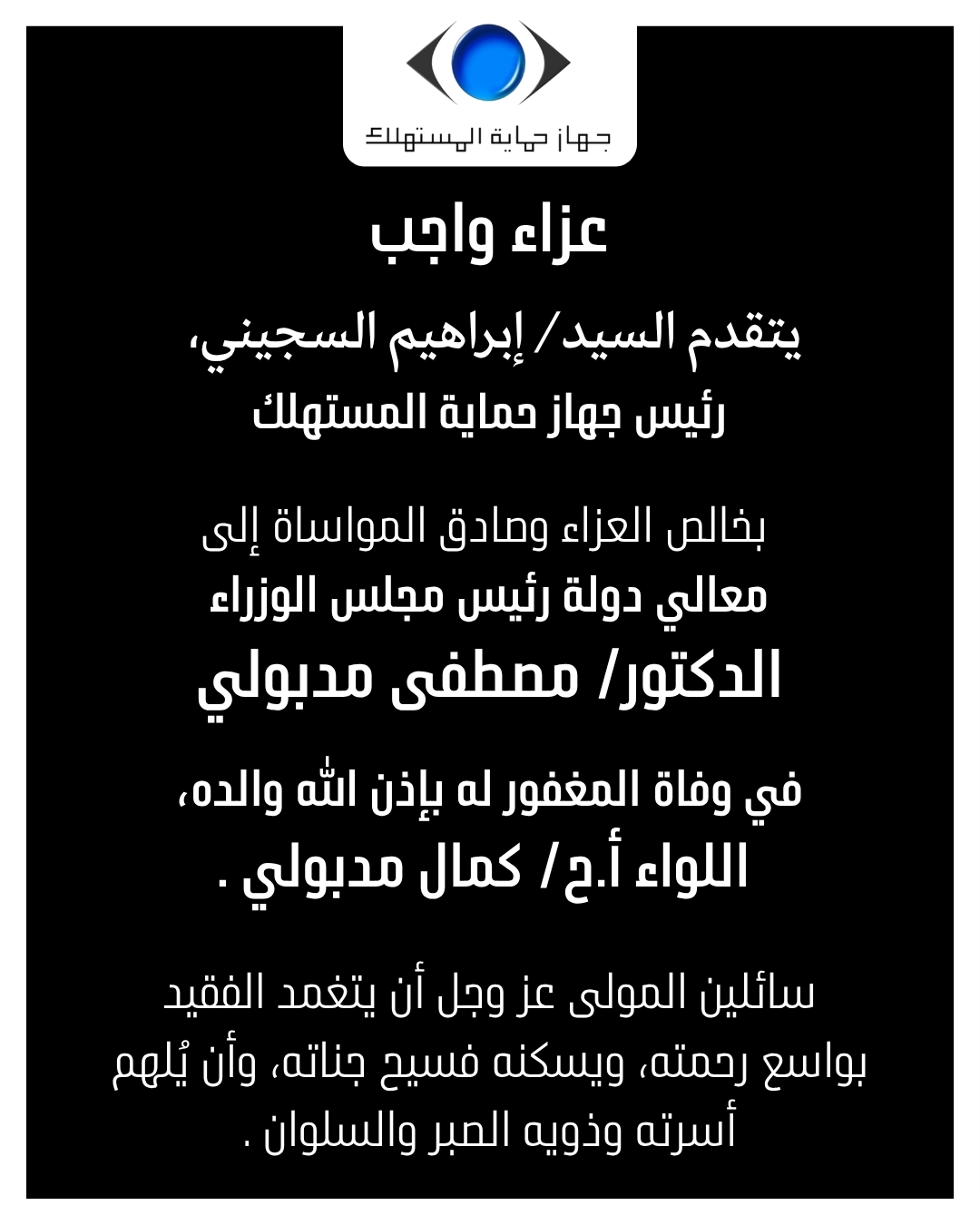 يتقدم السيد ابراهيم السجيني رئيس جهاز حماية المستهلك بخالص العزاء وصادق المواساة إلى معالي رئيس مجلس الوزراء الدكتور مصطفى مدبولي، في وفاة المغفور له بإذن الله والده، اللواء أ.ح كمال مدبولي.