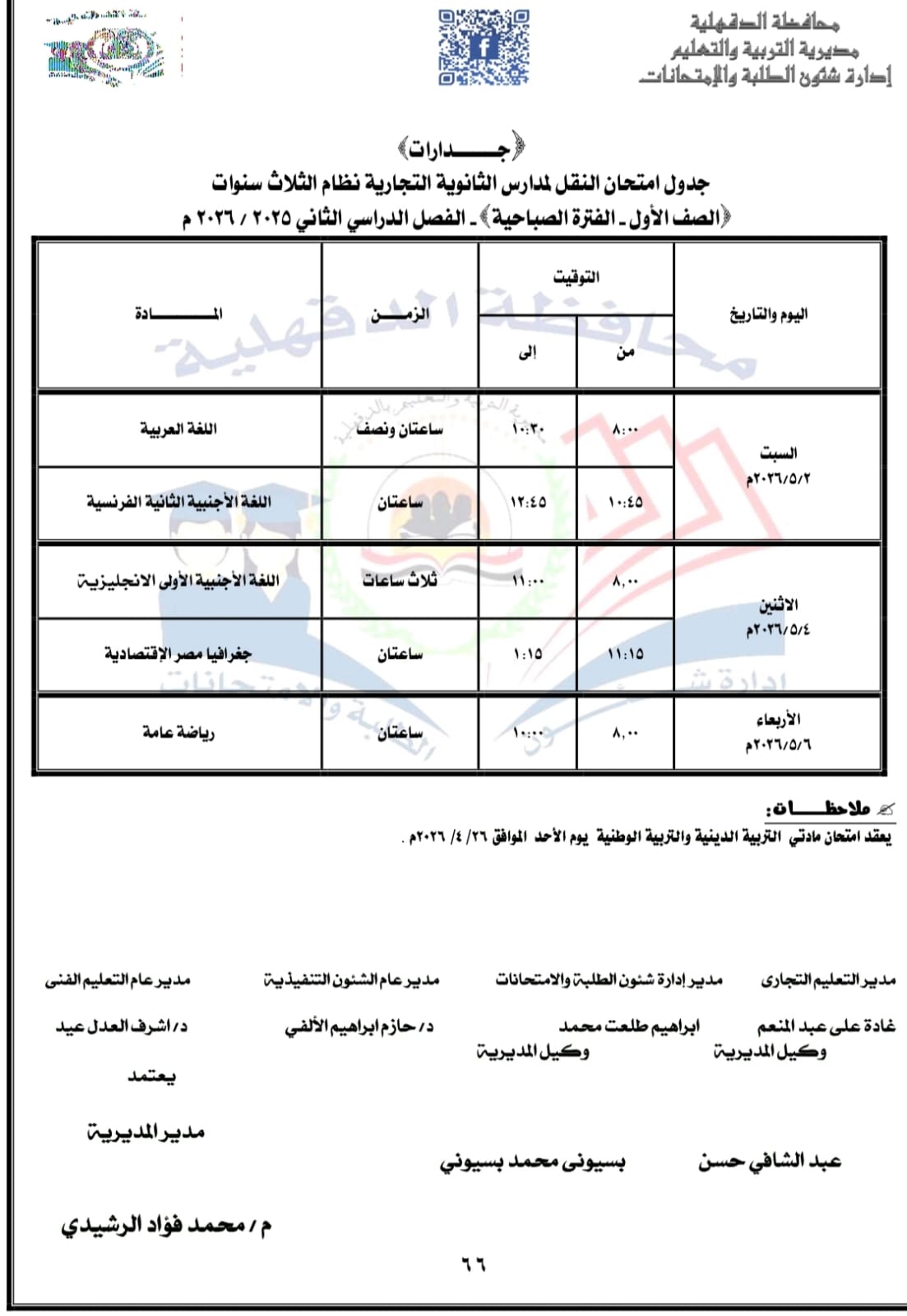 أعلنت مديريات التربية والتعليم عن جدول امتحانات التعليم التجاري للعام الدراسي 2025/2026، وذلك في إطار الاستعدادات لانطلاق امتحانات نهاية العام لطلاب الدبلومات الفنية.