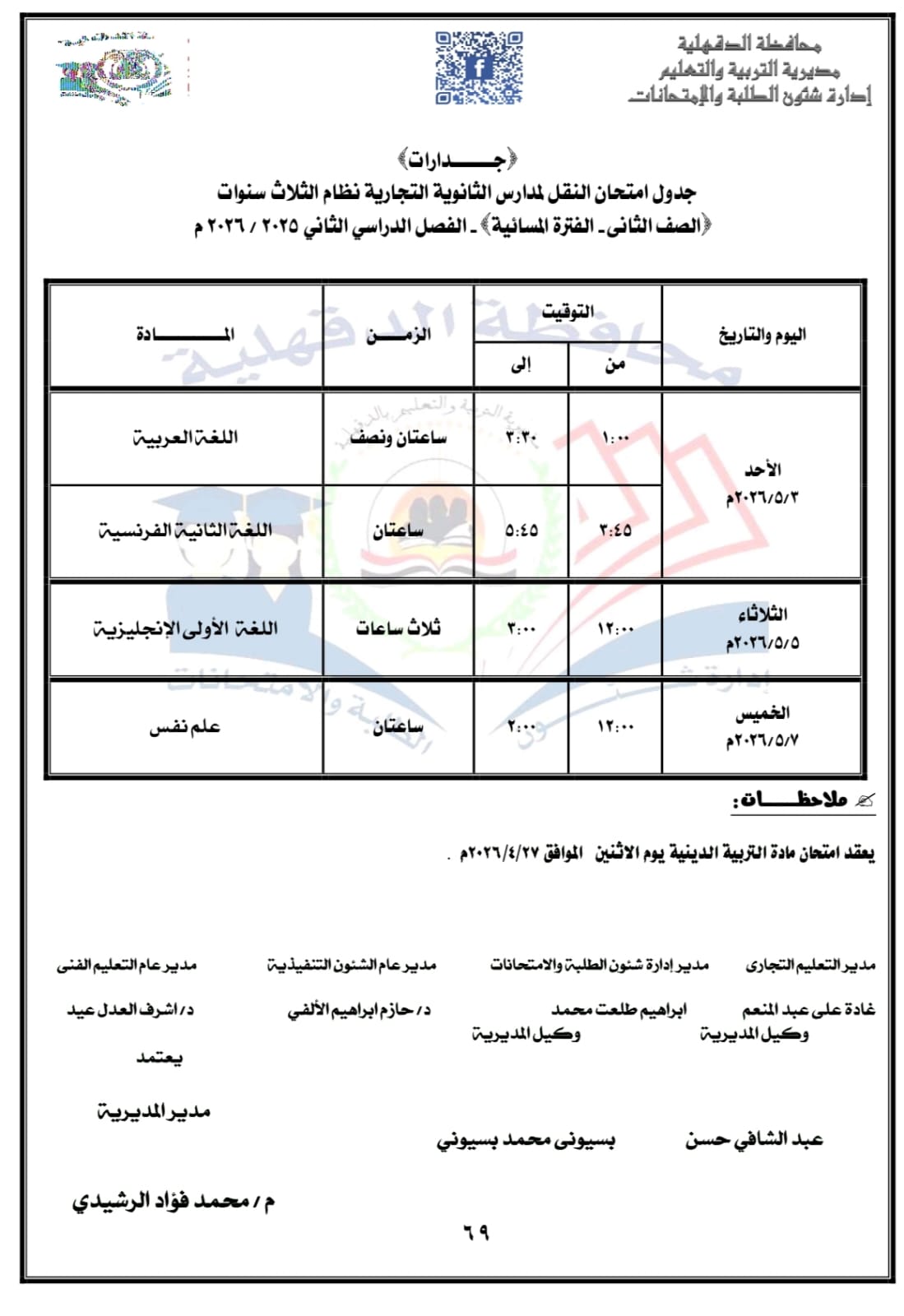 ودعت الوزارة الطلاب وأولياء الأمور إلى متابعة الجداول الرسمية المعلنة من خلال المدارس أو المواقع الإلكترونية التابعة لمديريات التعليم، للتأكد من مواعيد كل مادة بدقة.