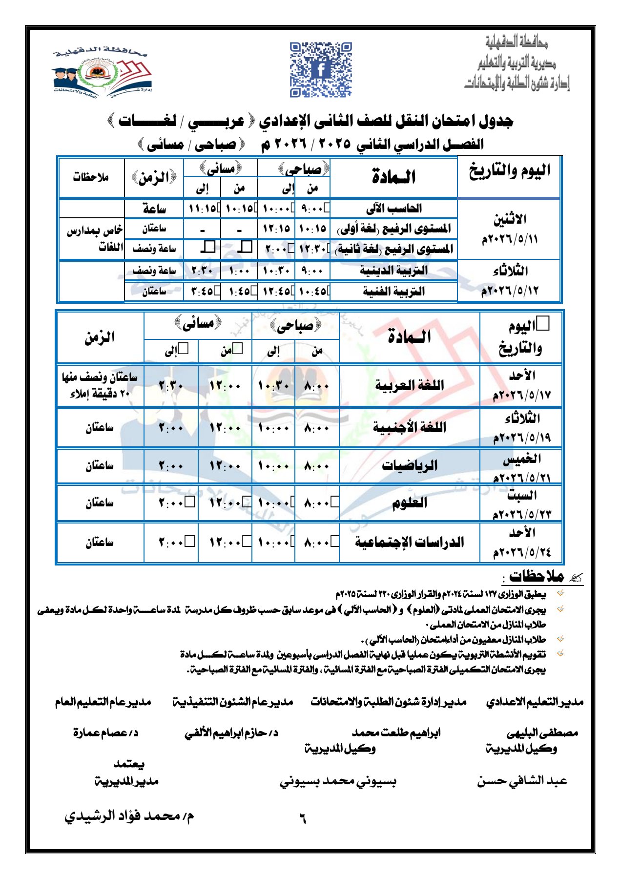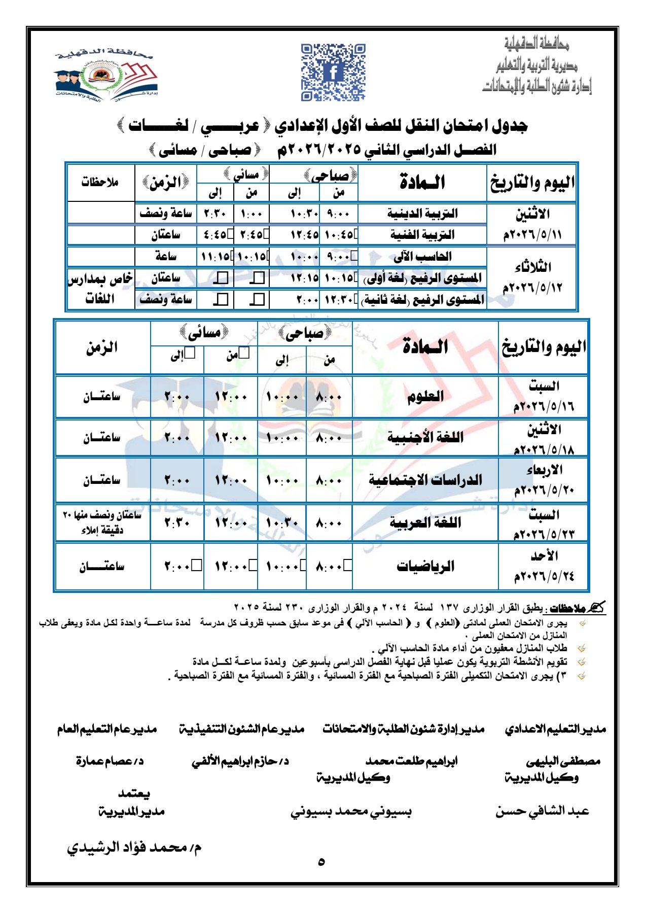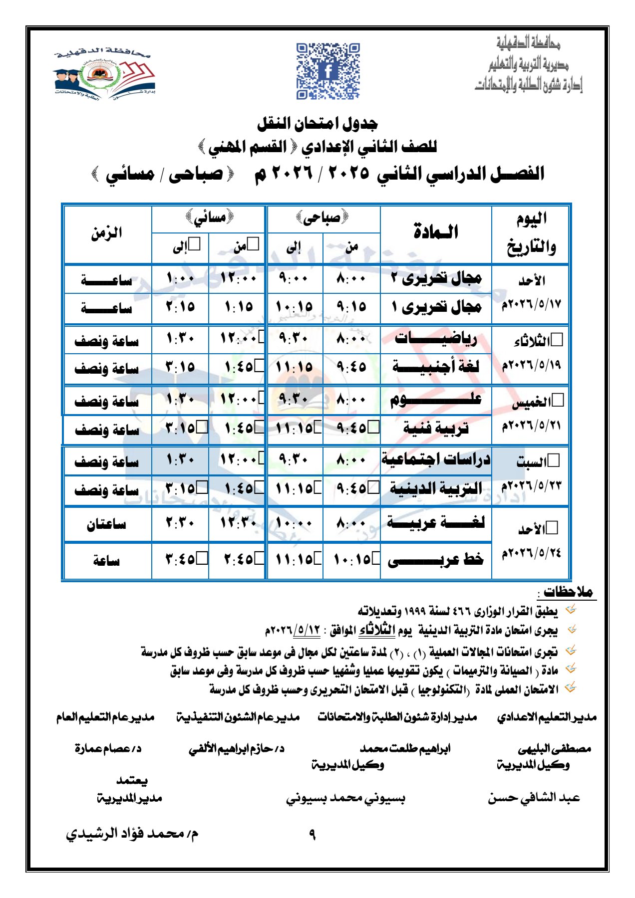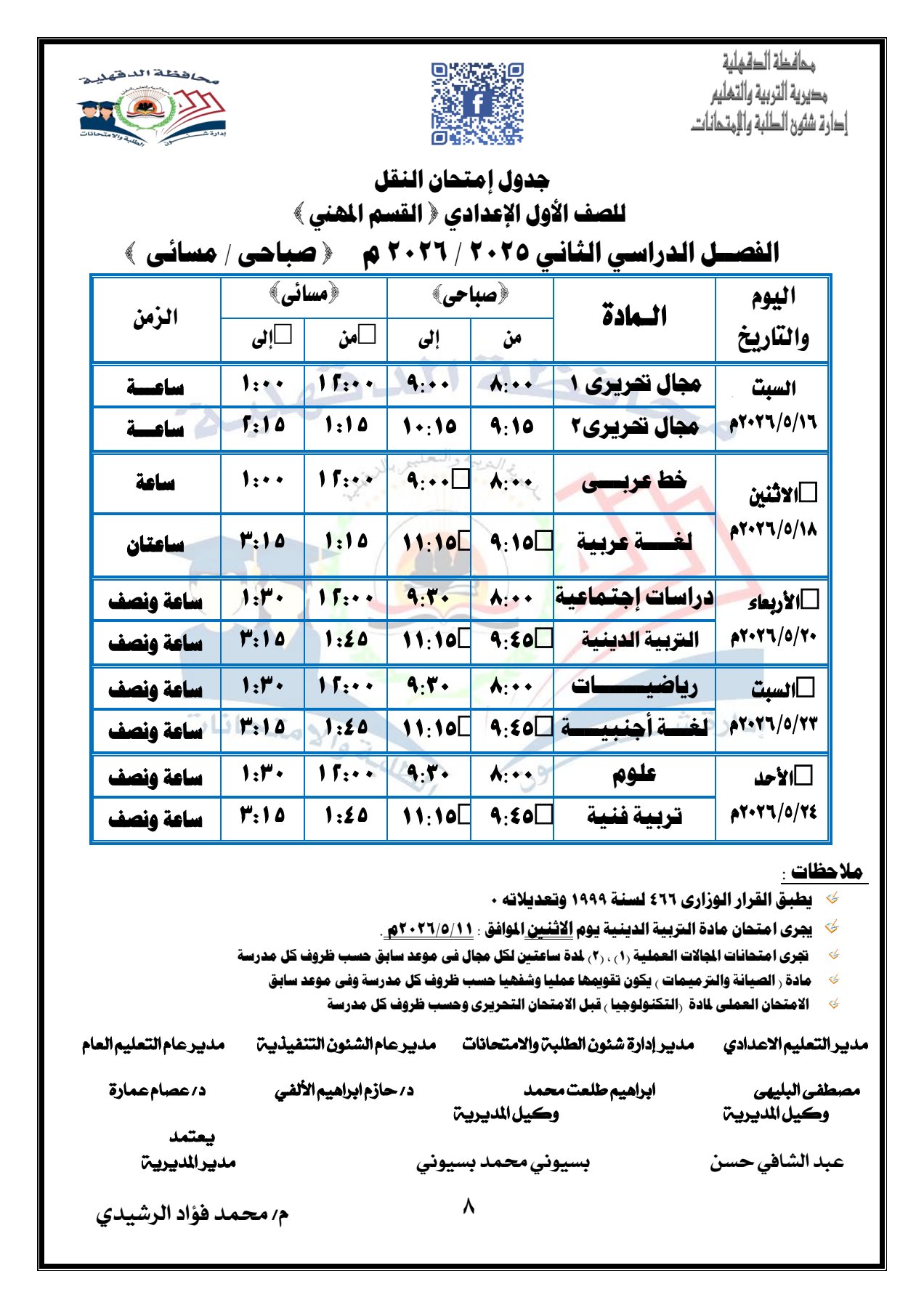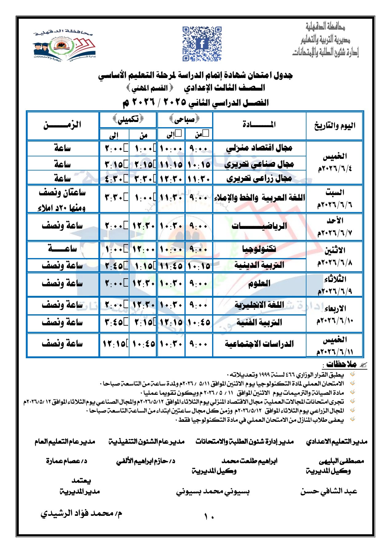 الدقهلية تعلن جدول امتحانات الشهادة الإعدادية (القسم المهني) للفصل الدراسي الثاني