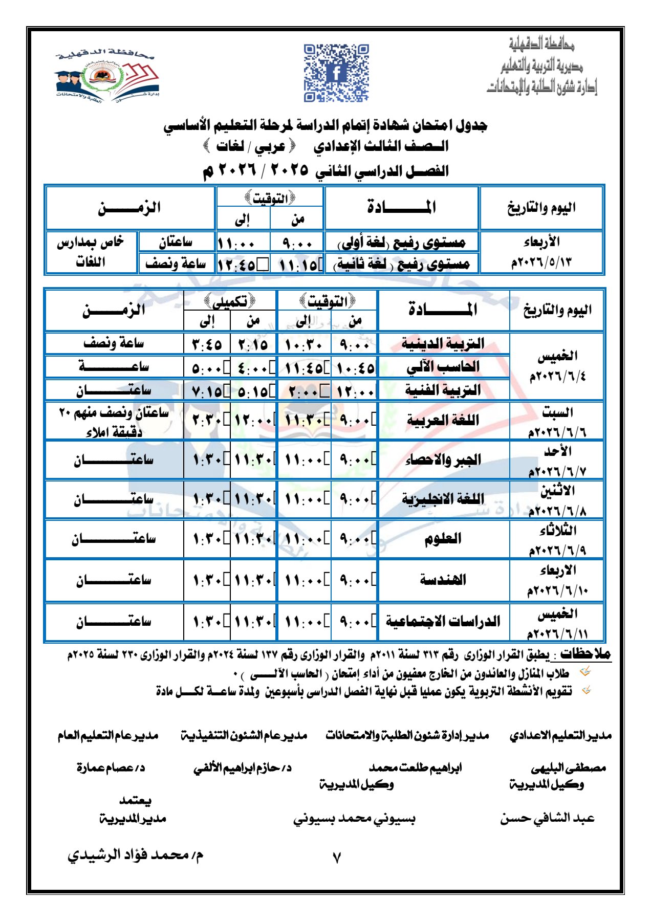 أعلنت مديرية التربية والتعليم بمحافظة الدقهلية، إتاحة جدول امتحانات مرحلة التعليم الأساسي – الصف الثالث الإعدادي (القسم المهني)، وذلك ضمن الاستعدادات لانطلاق امتحانات الفصل الدراسي الثاني للعام الدراسي 2025/2026.