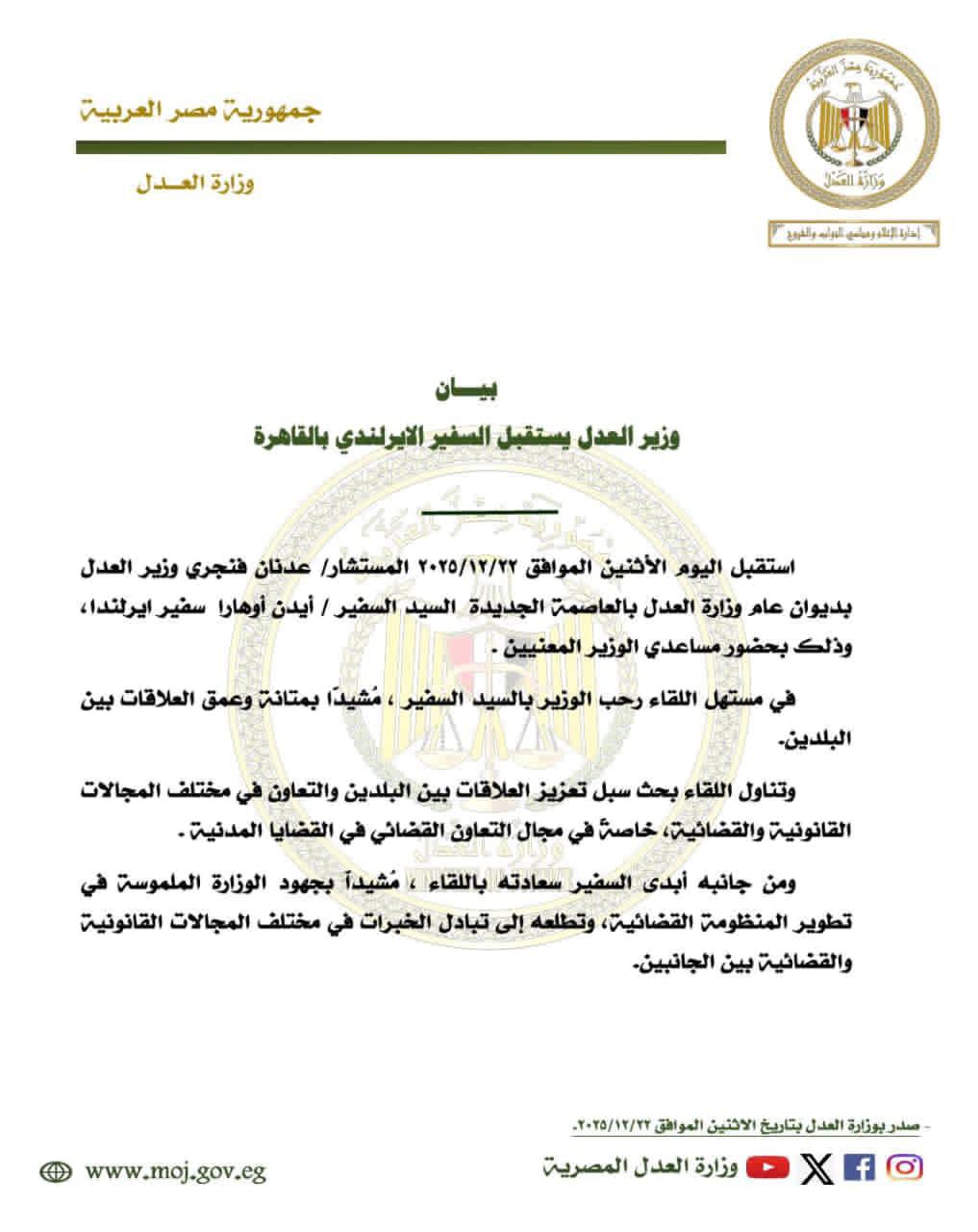 استقبل اليوم الأثنين الموافق 22/12/2025 المستشار/ عدنان فنجري وزير العدل بديوان عام وزارة العدل بالعاصمة الجديدة السيد السفير / أيدن أوهارا سفير ايرلندا، وذلك بحضور مساعدي الوزير المعنيين .